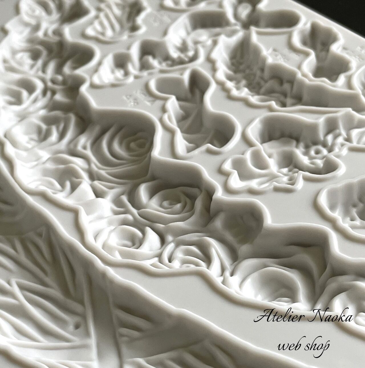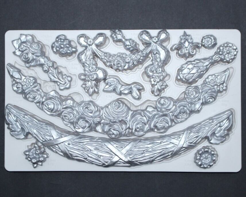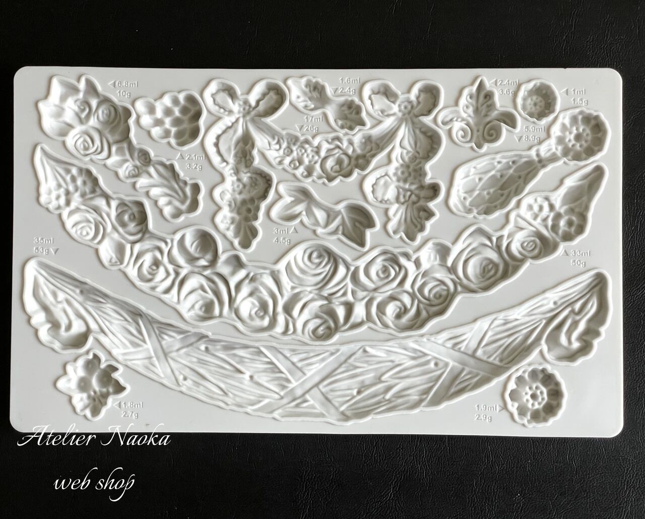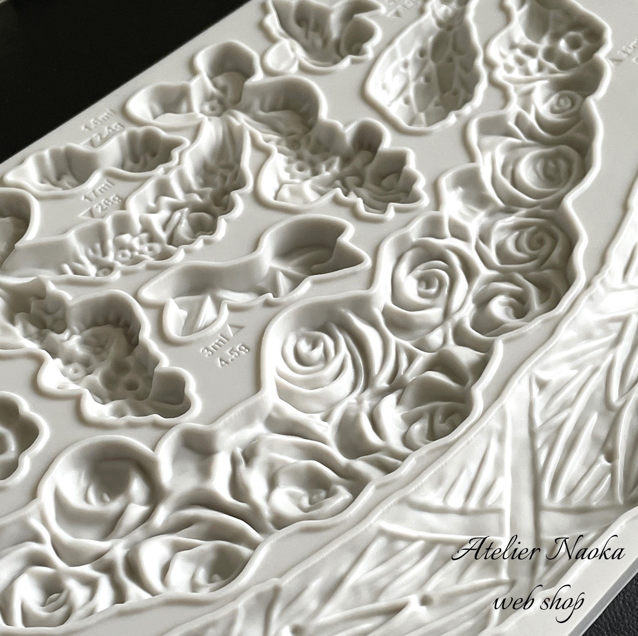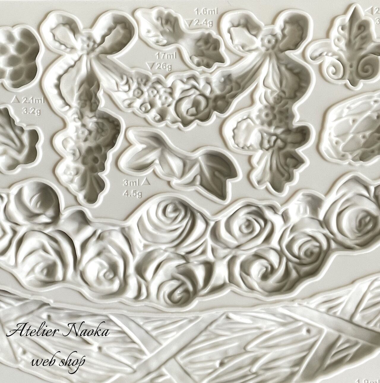 フラワー、リボンモチーフがセットになったシリコンモールドです。