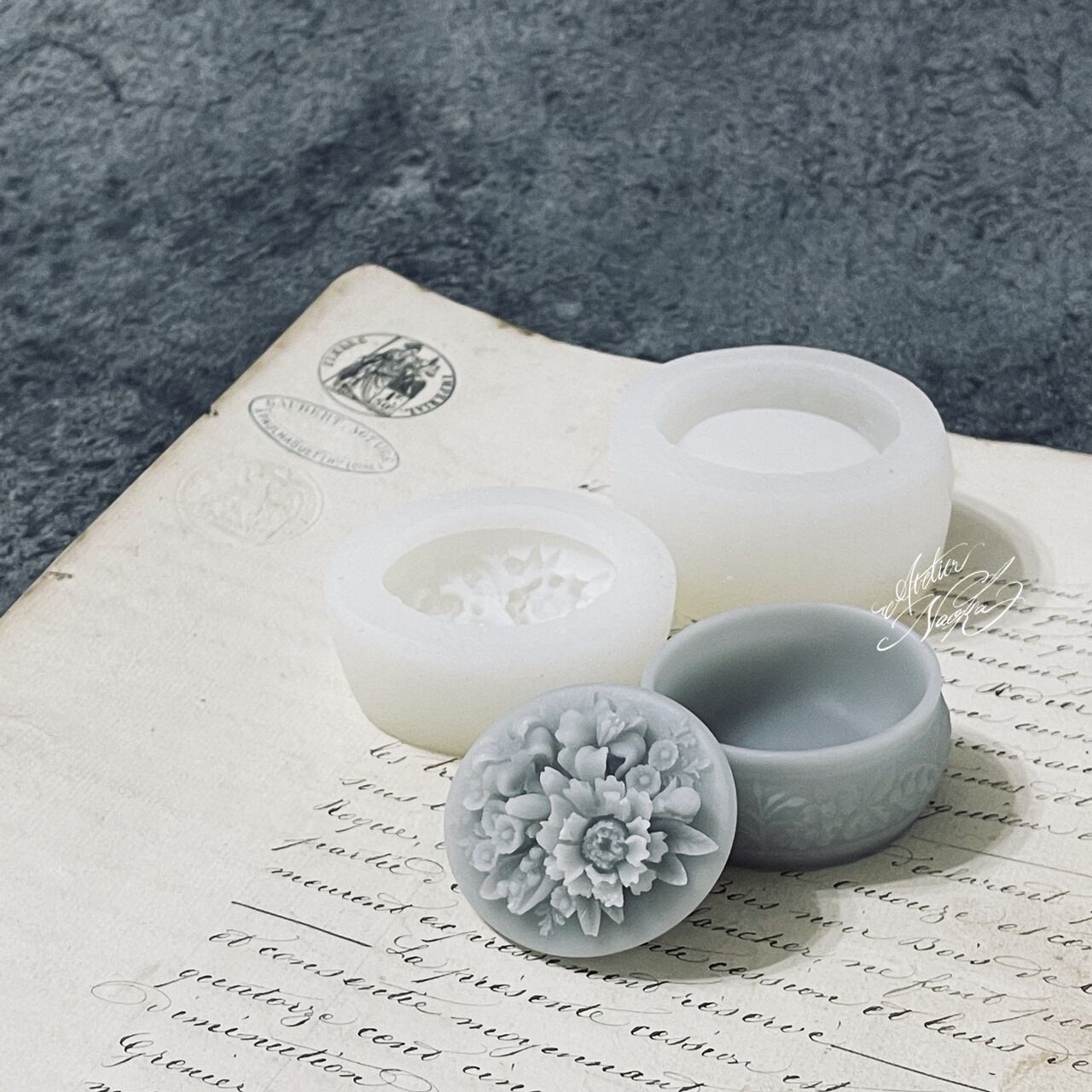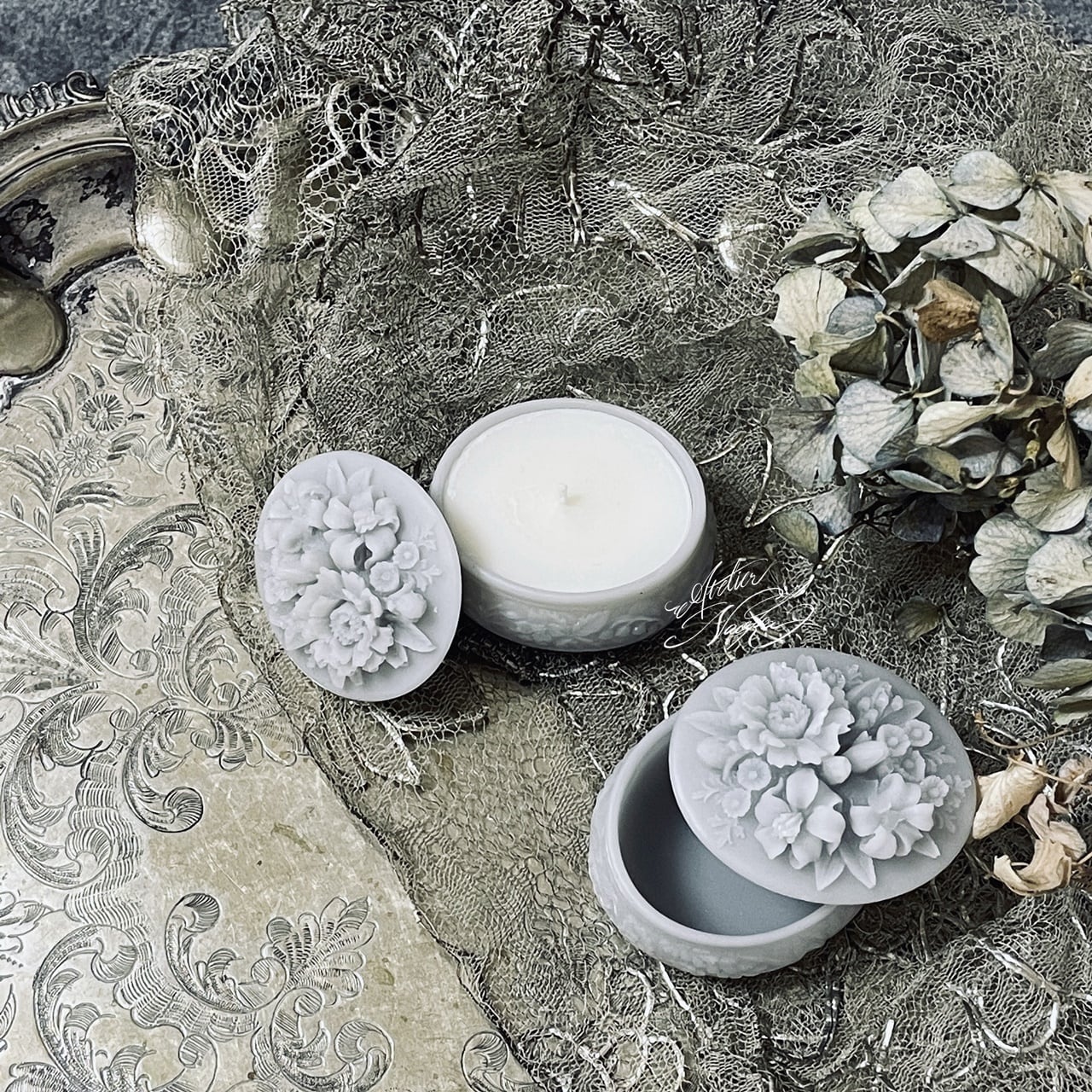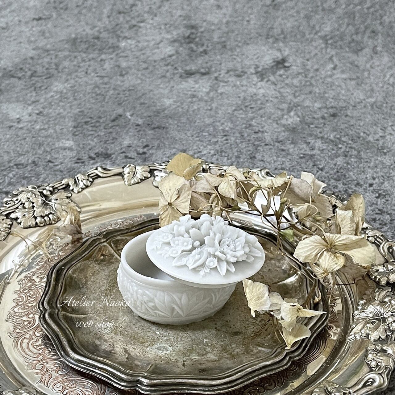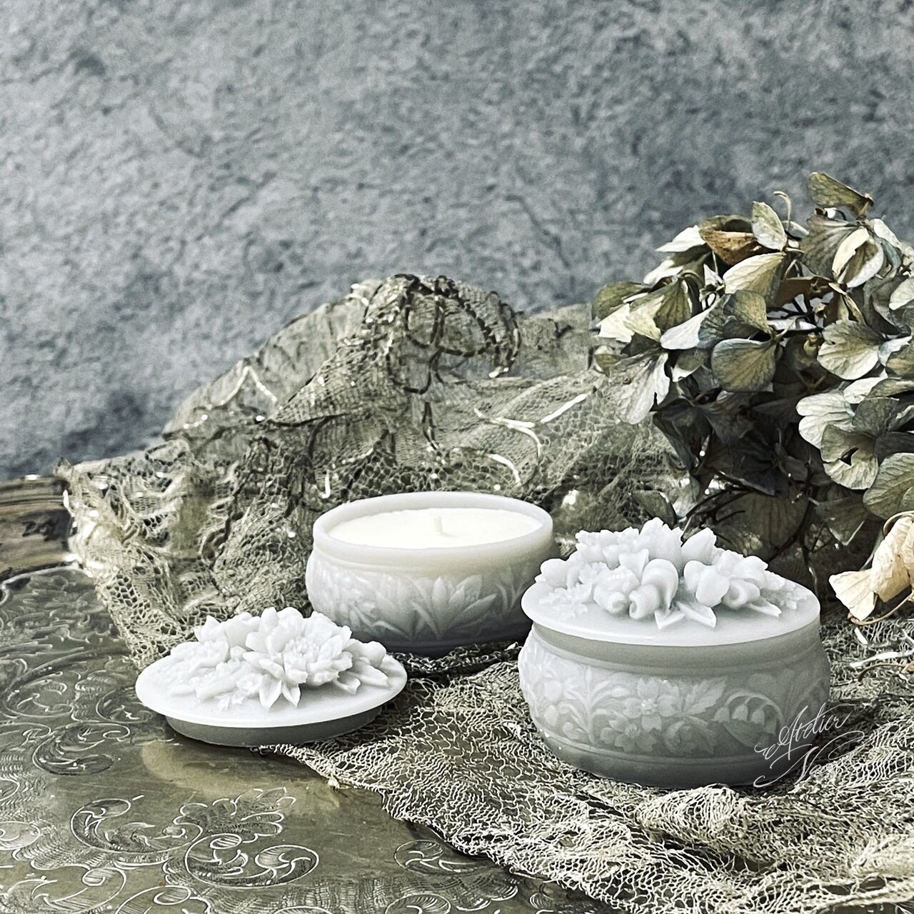 お花が施された蓋が魅力なシリコンモールドです。