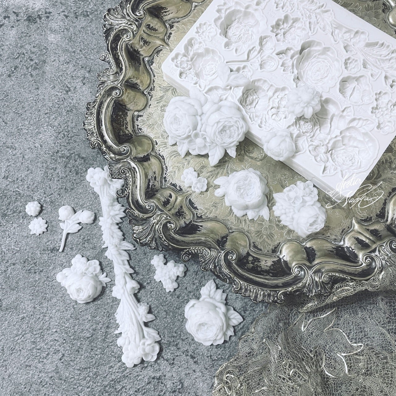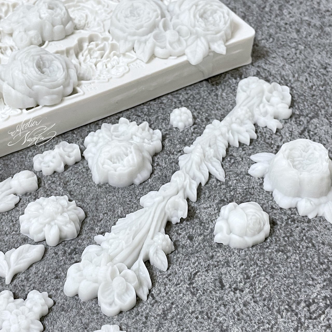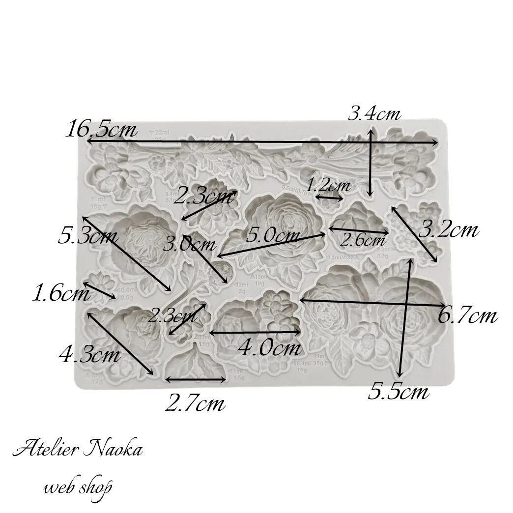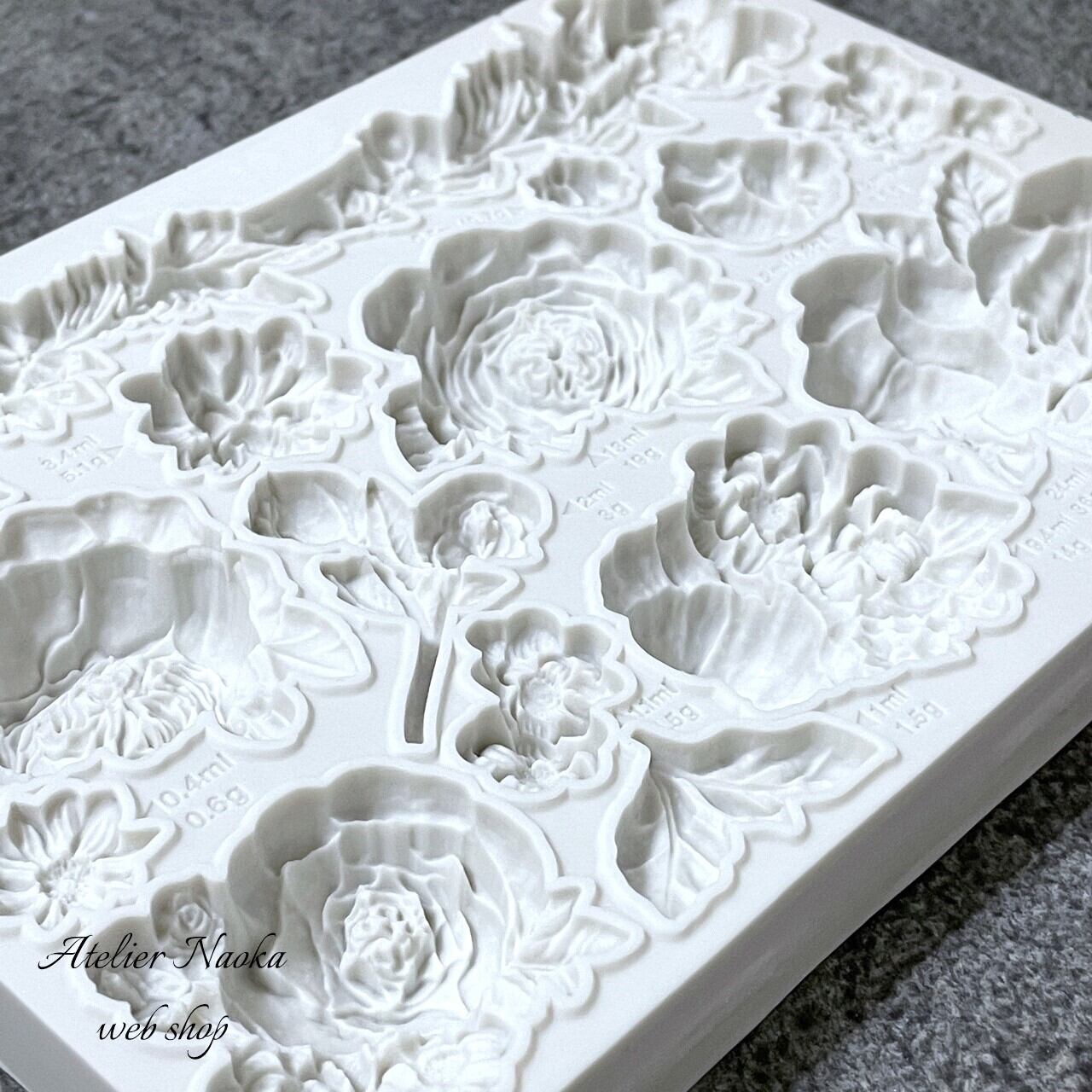 優雅なカップ咲きの薔薇やモチーフが14種類入ったシリコンモールドです。