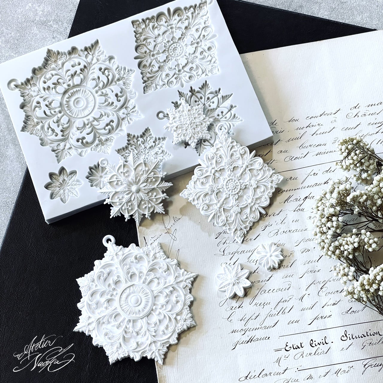 6種類の雪の結晶型がセットになったシリコンモールドです。